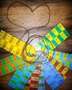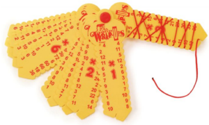 В лявата част напишете задачи, а в дясната – отговорите им в разбъркан ред. Закрепете връв към пособието и свържете въпросите и отговорите като започнете от първия въпрос, прекарвате връвта отзад на пособието и свързвате с отговора. Щом сте готови, на задната част на лентата повторете с флумастер линиите, които са се образували от връвта. След това ламинирайте и изрежете.